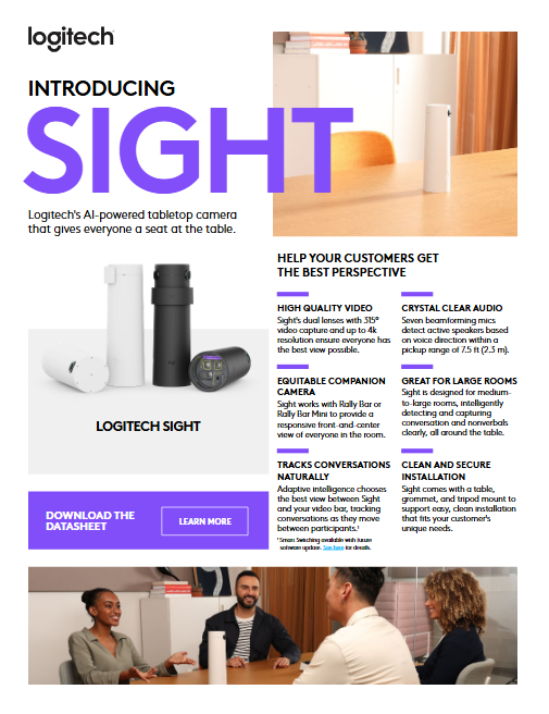 The Logitech Sight is an AI-powered, 360-degree tabletop camera. It provides a front-and-center perspective of in-room interactions. Its intelligent multi-participant framing automatically switches between the cameras when a person’s voice is detected.
